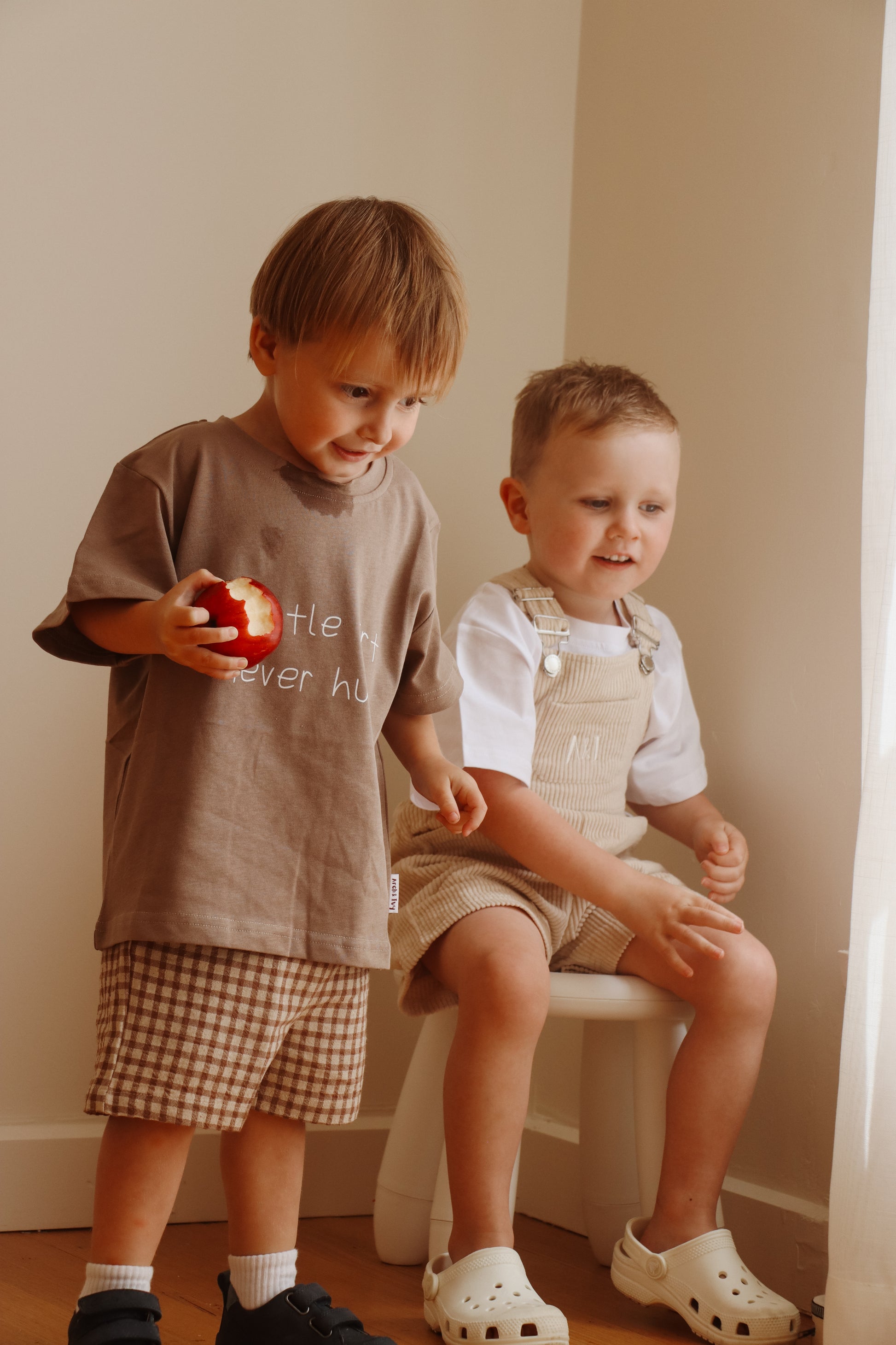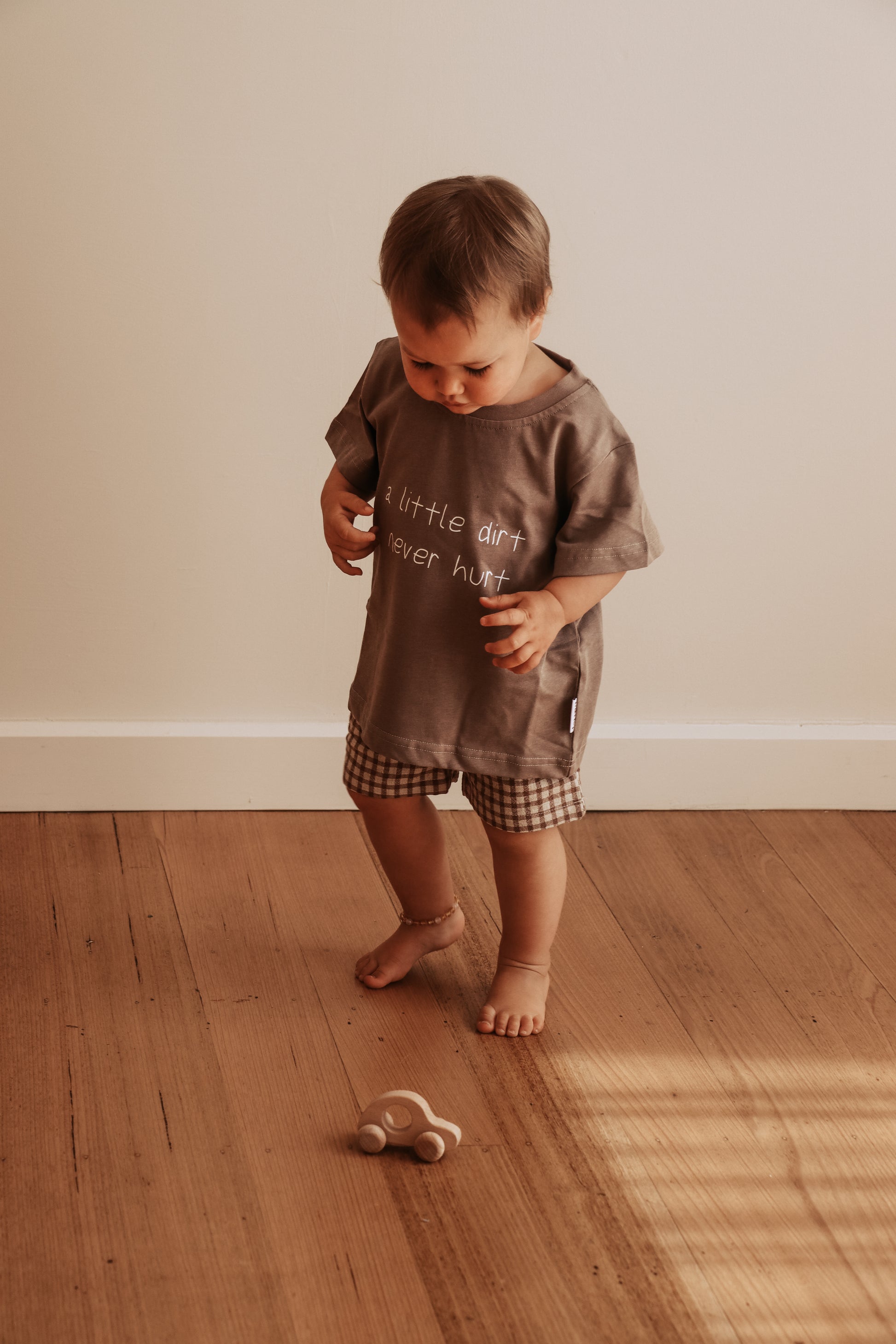 Tide Shorts are made for little ones who love to roam wild. With a soft chocolate hue and comfy elastic waistband, they’re the go to staple for beach days, bush trails, and everything in between. Pair them with the “a little dirt never hurt tee” for the ultimate matching set.